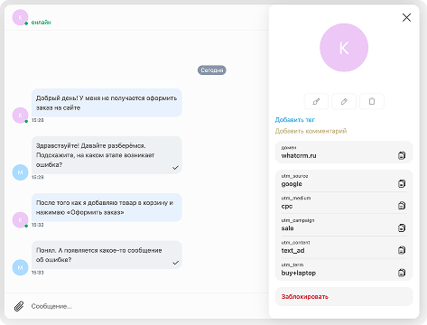 Идентифицируйте клиентов и узнавайте, откуда они пришли на сайт. Используйте utm-метки для онлайн-чатов и переписки в мессенджерах.