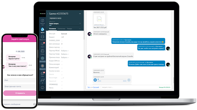 Интегрируйте онлайн-чат и мессенджеры с CRM. Ведите единый диалог с клиентом, обменивайтесь сообщениями и документами прямо из корпоративной базы.