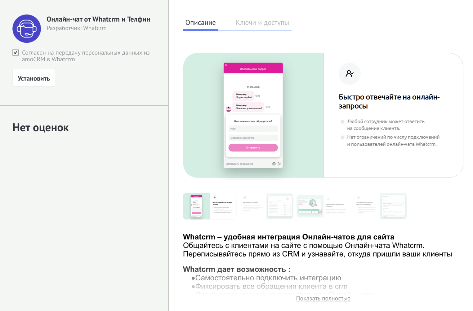Нет ограничений по числу подключений и пользователей онлайн-чата Whatcrm.